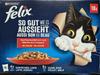 FELIX So gut wie es aussieht Geschmacksvielfalt vom Land ist eine Auswahl unwiderstehlicher Mahlzeiten, die so lecker aussehen, riechen und schmecken, als hättest du sie selbst gemacht. Jede Mahlzeit kombiniert zarte Stückchen und ein saftiges Gelee zu einem unwiderstehlich leckeren Gericht, das deine Katze lieben wird!