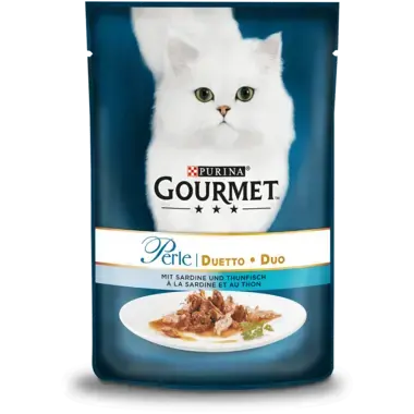 GOURMET Perle Duetto ist ein Katzennassfutter mit sorgfältig ausgesuchten Kompositionen aus erlesenen Streifen mit Huhn und Rind, Lachs und Weißfisch und anderen köstlichen Geschmacksrichtungen. Besonders schonend in schmackhafter Sauce gegart, um den feinen Gaumen deiner Katze zu verwöhnen.